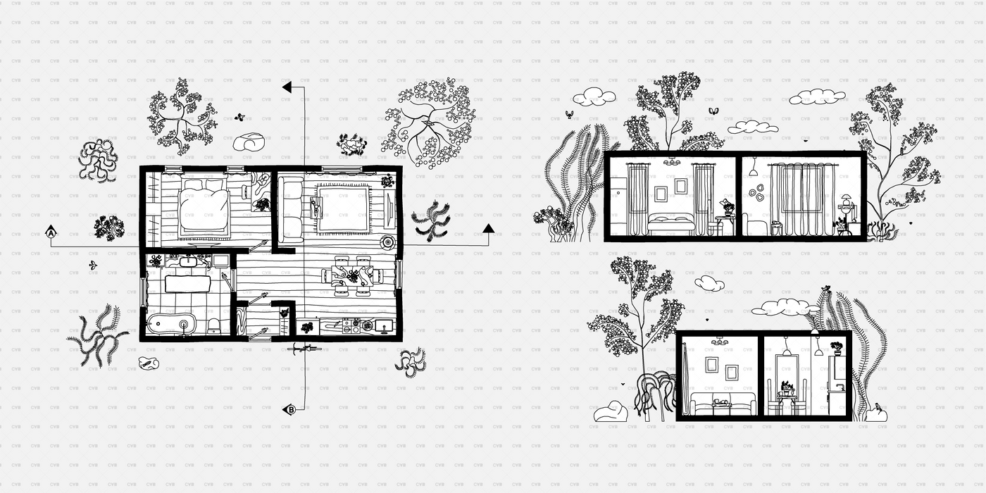 Download a complete architectural project template of a cozy apartment in both Black and White CAD Blocks and Colorful Vector Drawings.Â