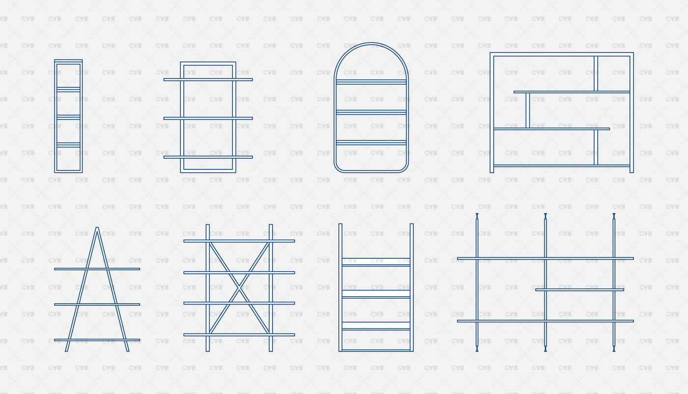 - 8 ready-to-use dynamic blocks: Ladder Shelf, A-Frame Shelf, Cross-Braced Shelf, Modular Bookcase, Tall Bookcase, Display Island, Wall Grid System, Arched Display Shelf.