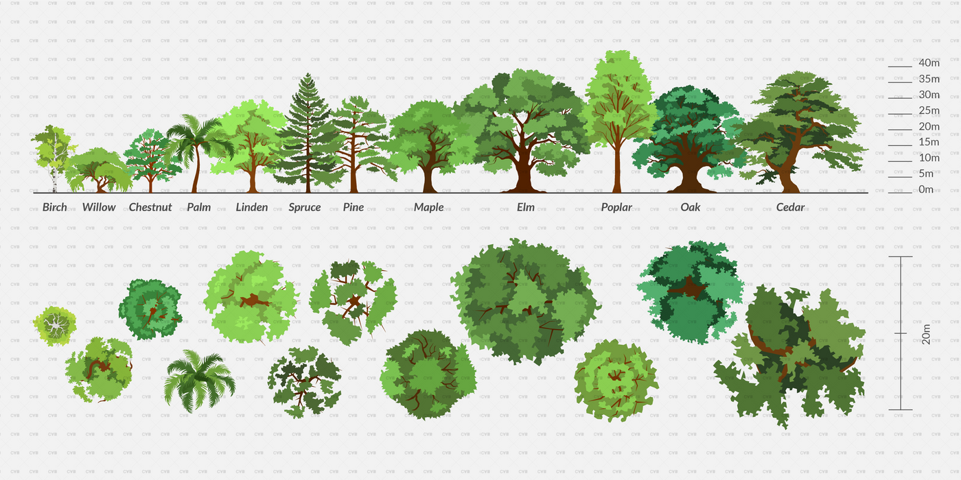 Explore our vibrant Vector Colorful Common Trees collection, featuring 12 popular tree species in both colorful and monochrome designs. Each tree type includes precise front and top views, ensuring they integrate seamlessly into your landscape projects.